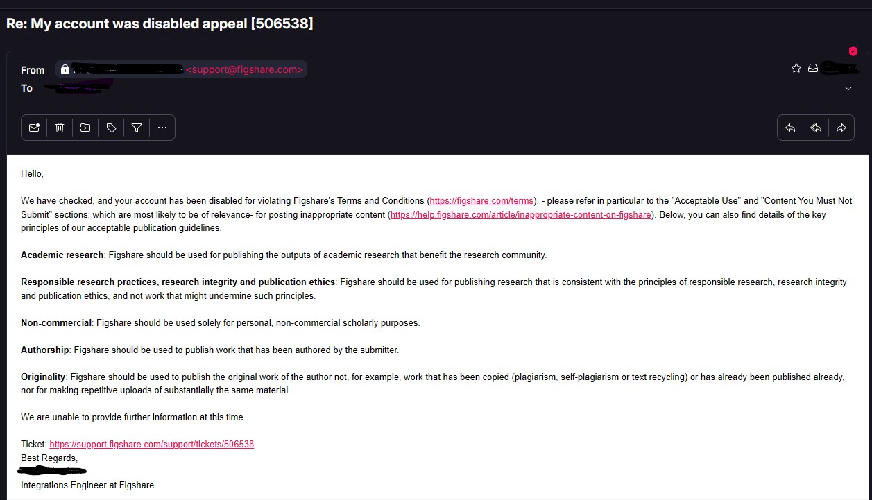 Figshare ban — My device was banned, account permanently disabled, blueprint deleted.
